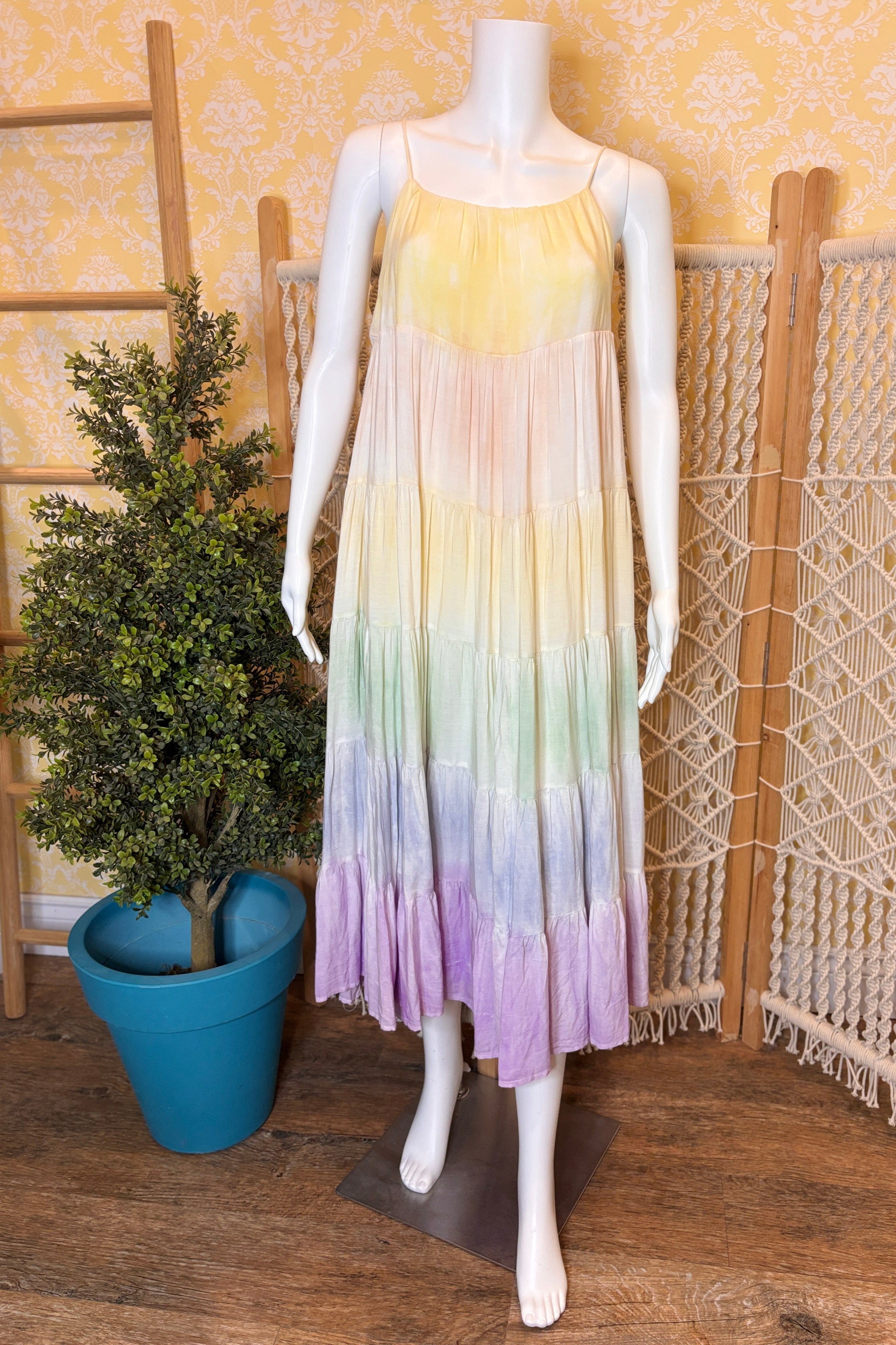 Embrace a dreamy vibe with this whimsical pastel ombre maxi dress from STORIA, brand new with tags. Its flowing silhouette and soft gradient hues create a playful, ethereal look perfect for sunny days or special occasions. This dress combines comfort with a splash of color that brightens any wardrobe. Let your style float effortlessly with this charming maxi dress that’s as fun as it is feminine.
